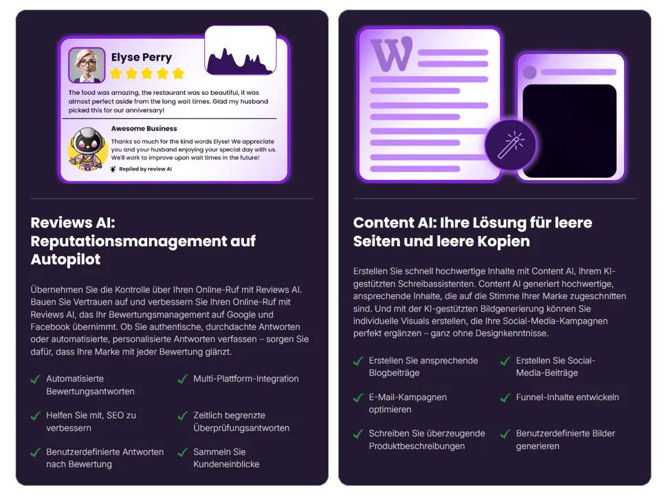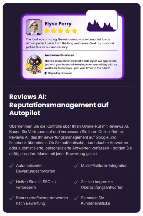 Mit Reviews AI können Sie automatisch auf Bewertungen auf Plattformen wie Google und Facebook reagieren und so Ihren Ruf verbessern und gleichzeitig Zeit sparen. Wählen Sie zwischen Suggestive Mode für personalisierte Antworten oder Auto-Pilot für vollständige Automatisierung.