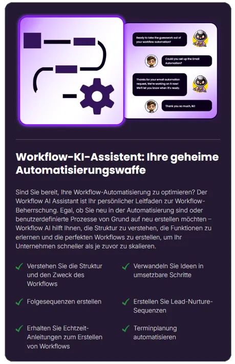 Der Workflow AI Assistant hilft Ihnen, die Workflow-Komponenten zu verstehen und bietet Ihnen die Schritte, die Sie benötigen, um benutzerdefinierte Workflows zu erstellen, die Ihren spezifischen Geschäftsanforderungen entsprechen.