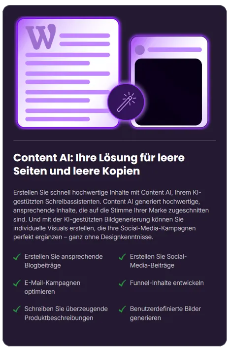 Content AI helps you create high-quality content quickly. Whether you need social posts, emails, or blog sections, it can generate text (and images!) in seconds, saving you hours of work.